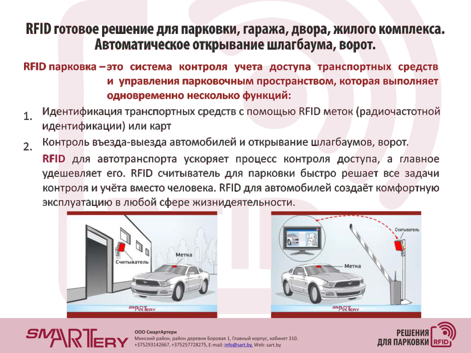 В области шлагбаума устанавливается RFID-считыватель с двумя подключенными к нему антеннами – одна направлена на въезд на парковку, другая – на выезд. В машине помещается RFID-метка, которая может ловить сигнал антенны на расстоянии до 12 метров. Если машине разрешен въезд, то считыватель подает сигнал и управляет шлагбаумом, впуская транспорт на парковку. Таким образом легко ведется учет и контроль автотранспорта.