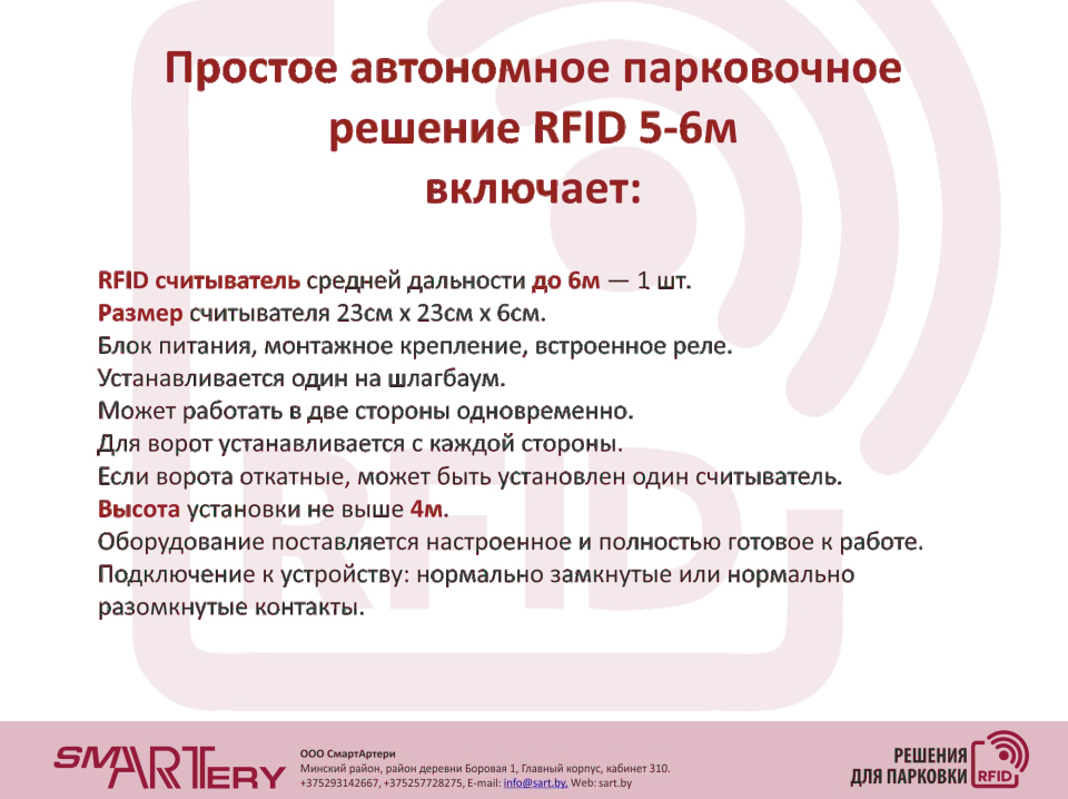 Внимание! Выгодно! ГОТОВЫЙ RFID-КОМПЛЕКС для парковки. Специально разработан для малого и среднего бизнеса, а также для владельцев гаражей, товариществ собственников, дачных кооперативов. Он включает готовый софт, настроенное оборудование и набор меток. Уже готов к установке, которая не требует особого навыка. Комплекс RFID прост в использовании. И очень надежен!